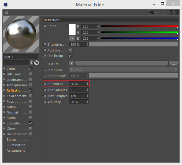 سنأتي للـ Blurriness وهي لعمل تشويش على الانعكاس نزيد من قيمتها إلى 20%